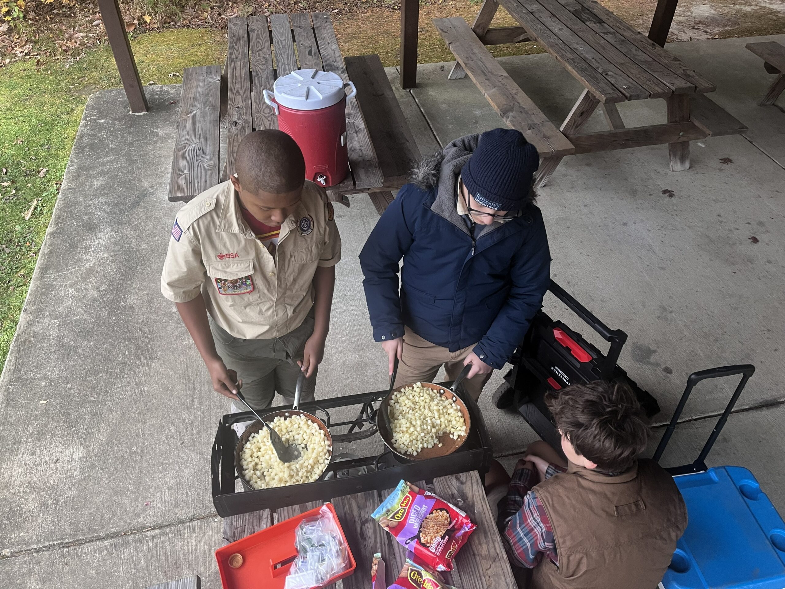 Every year the Troop celebrates Thanksgiving on our November camping trip, where we forego dining as Patrols, and we all join together in a meal prepared by the Scouts. The last few years we have started a new tradition of including families in this celebration of thanks. The troop invited parents and siblings for a Thanksgiving feast during the camping trip at Downs Park, where the Wcouts took charge of the main course — Teriyaki Chicken, Pineapple Chicken, and rice. To everyone’s pleasant surprise, it tasted really good. A few parents are now wondering if we can outsource weeknight dinners.
